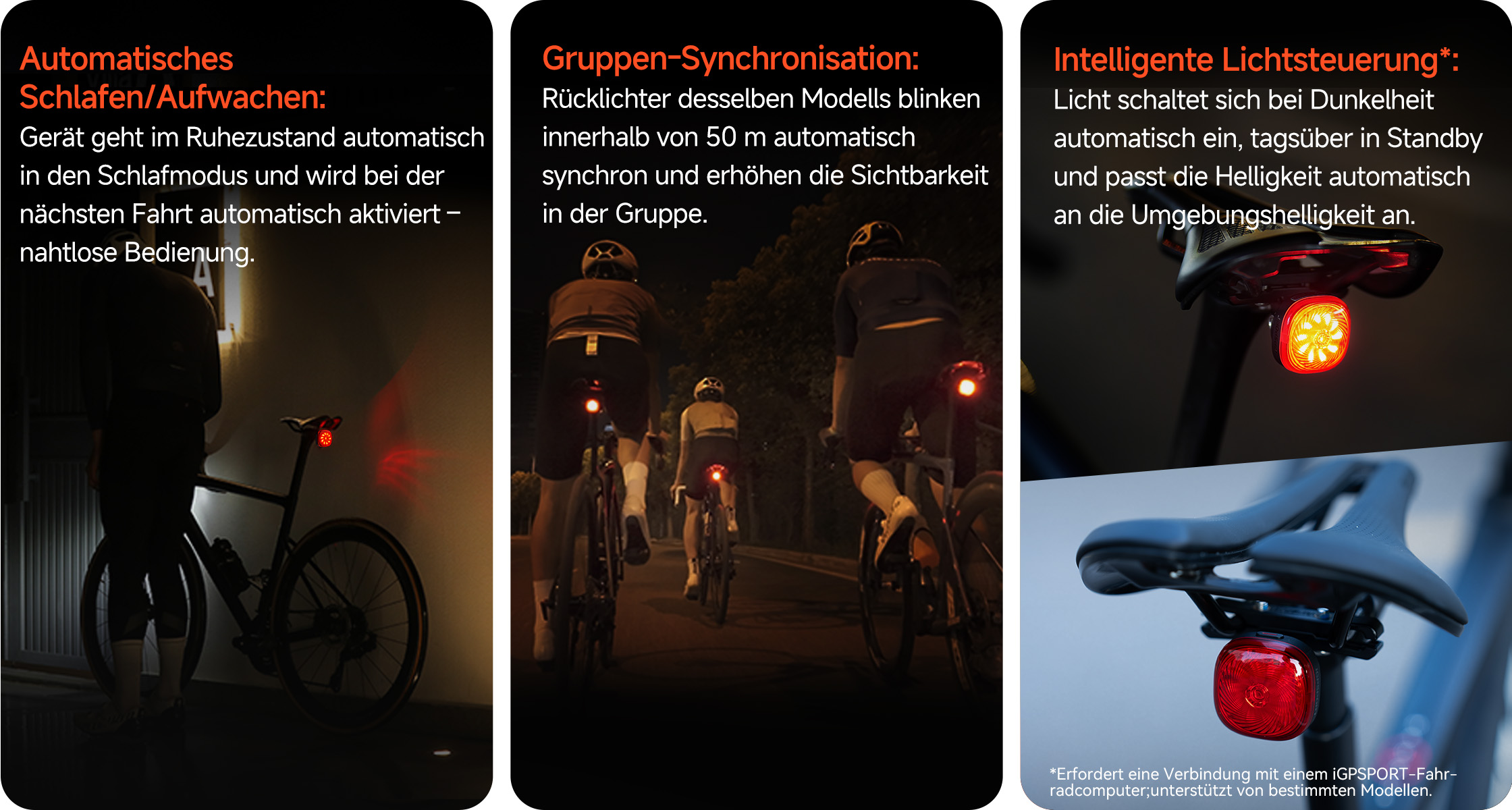 Vorder- und Rücklicht verbinden sich automatisch, wenn sie sich in der Nähe befinden. Unterstützt das synchrone Ein-/Ausschalten mit nur einem Knopfdruck – einfache Bedienung*.