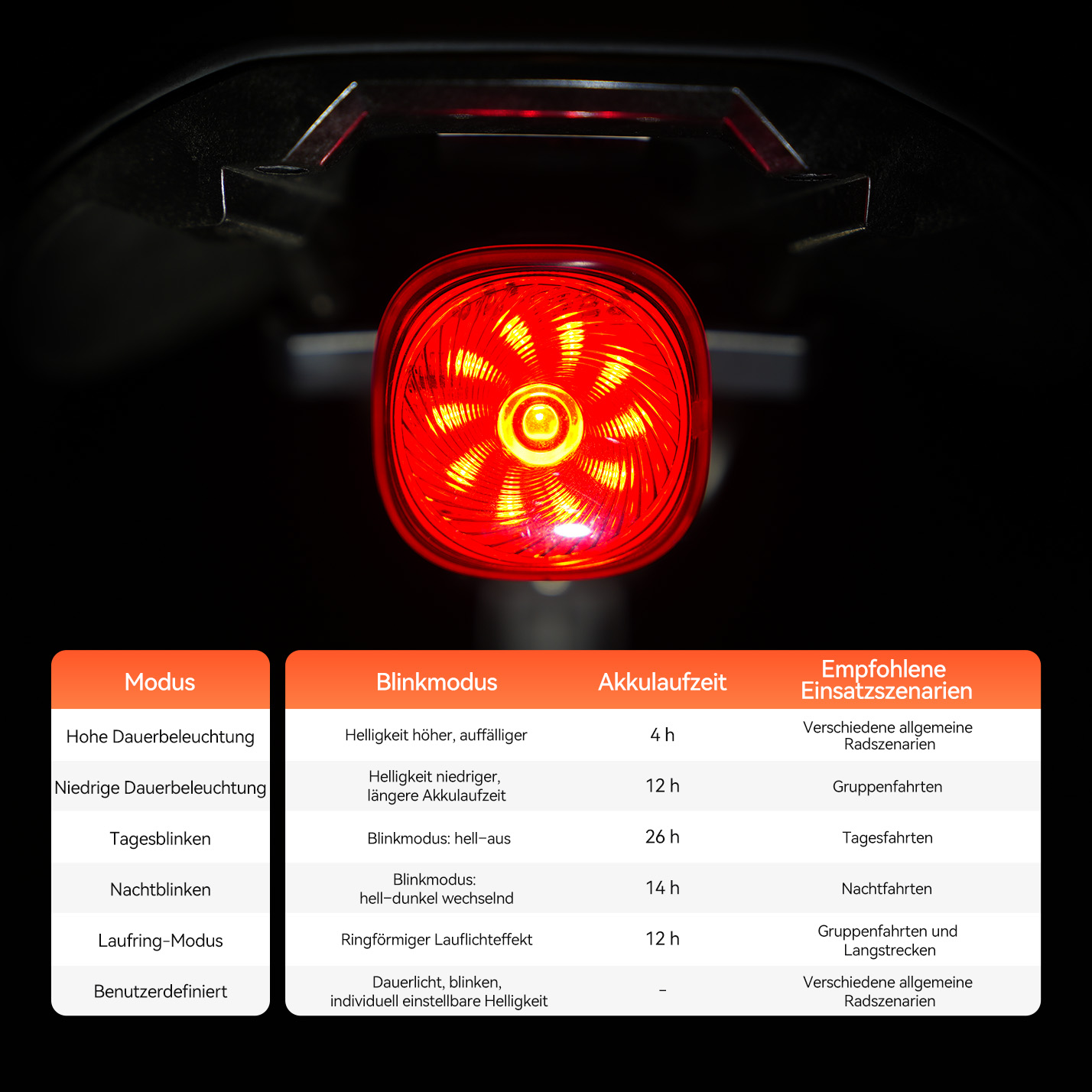 Eingebauter hochpräziser Beschleunigungssensor, automatisches Aufhellen beim Bremsen, aktive Warnung für nachfolgende Verkehrsteilnehmer, individuelle Bremslichthelligkeit einstellbar* .