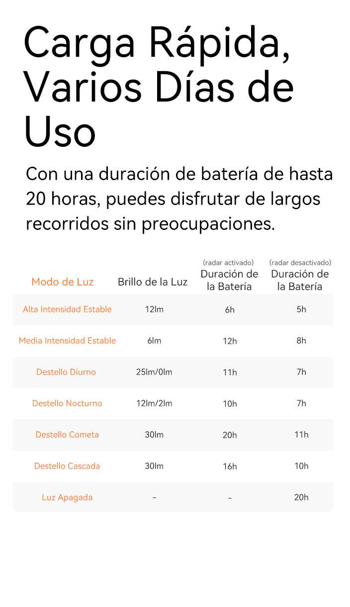 El radar puede monitorear hasta 8 objetivos simultáneamente. El lado del ciclocomputador muestra una barra de advertencia naranja, que se vuelve roja cuando se está adelantando, acompañada de alertas de audio. Esta combinación garantiza una protección integral para tu ciclismo.
