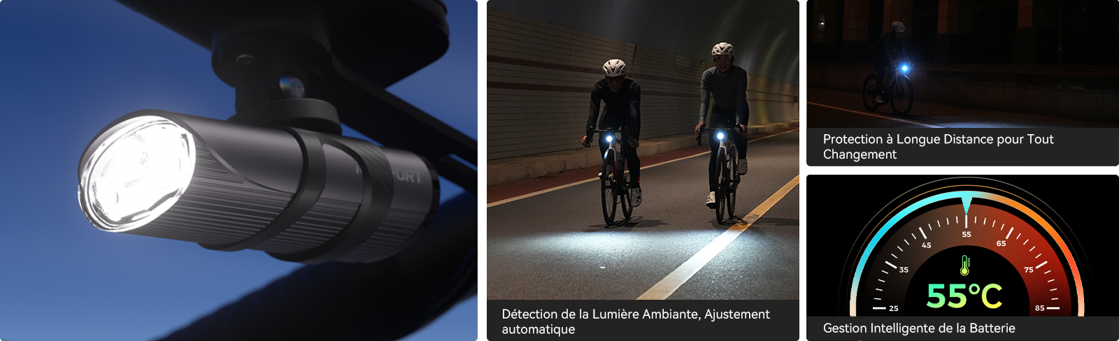 Découvrez une gamme complète de lumières pour le cyclisme nocturne, allant des phares avant à la luminosité puissante aux feux arrière intelligents avec différents modes d'éclairage.