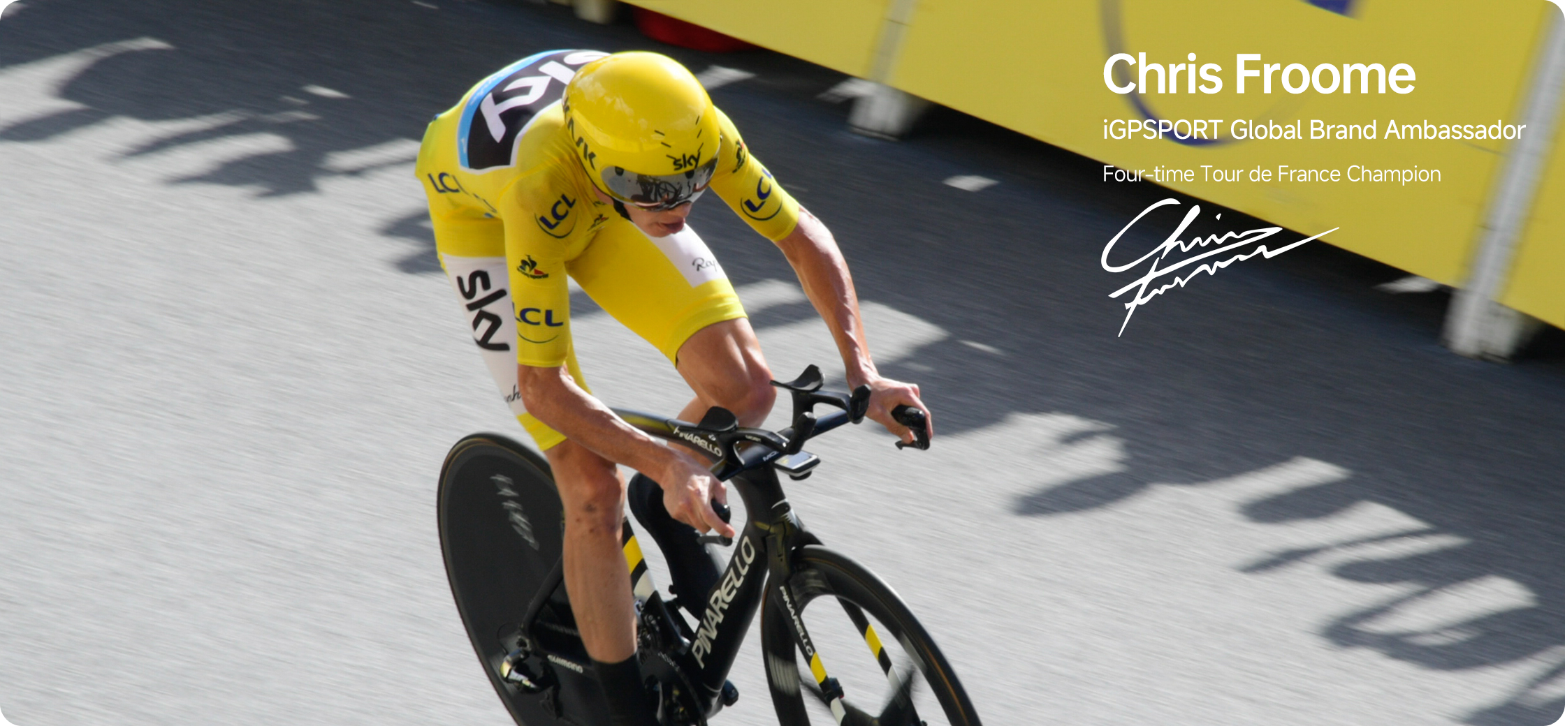 Christopher Clive Froome, coureur cycliste professionnel britannique, actuellement membre de l'équipe Israel-Premier Tech. En 2017, il a remporté le Tour de France, réalisant l'exploit de trois victoires consécutives et devenant le quadruple vainqueur en cinq ans. En 2018, il a en plus ajouté à son palmarès le maillot rose du Tour d'Italie. Le 20 mars 2024, il a été annoncé comme ambassadeur mondial de la marque iGPSPORT.