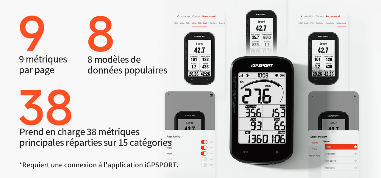 Prend en charge la connexion aux capteurs de vitesse, capteurs de cadence, moniteurs de fréquence cardiaque, compteurs de puissance, et aux feux avant et arrière intelligents iGPSPORT.*