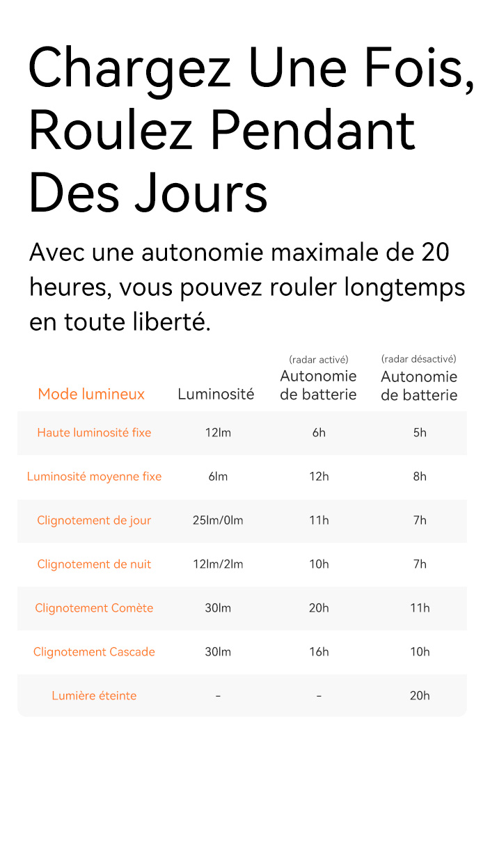En fonction de la détection de lumière par le compteur de vélo, la lumière s’allume automatiquement lorsqu’il fait sombre ou que vous entrez dans un tunnel, et s’éteint automatiquement en plein jour ou en sortant du tunnel, sans aucune opération manuelle nécessaire, offrant ainsi une protection intelligente pour les sorties de nuit.