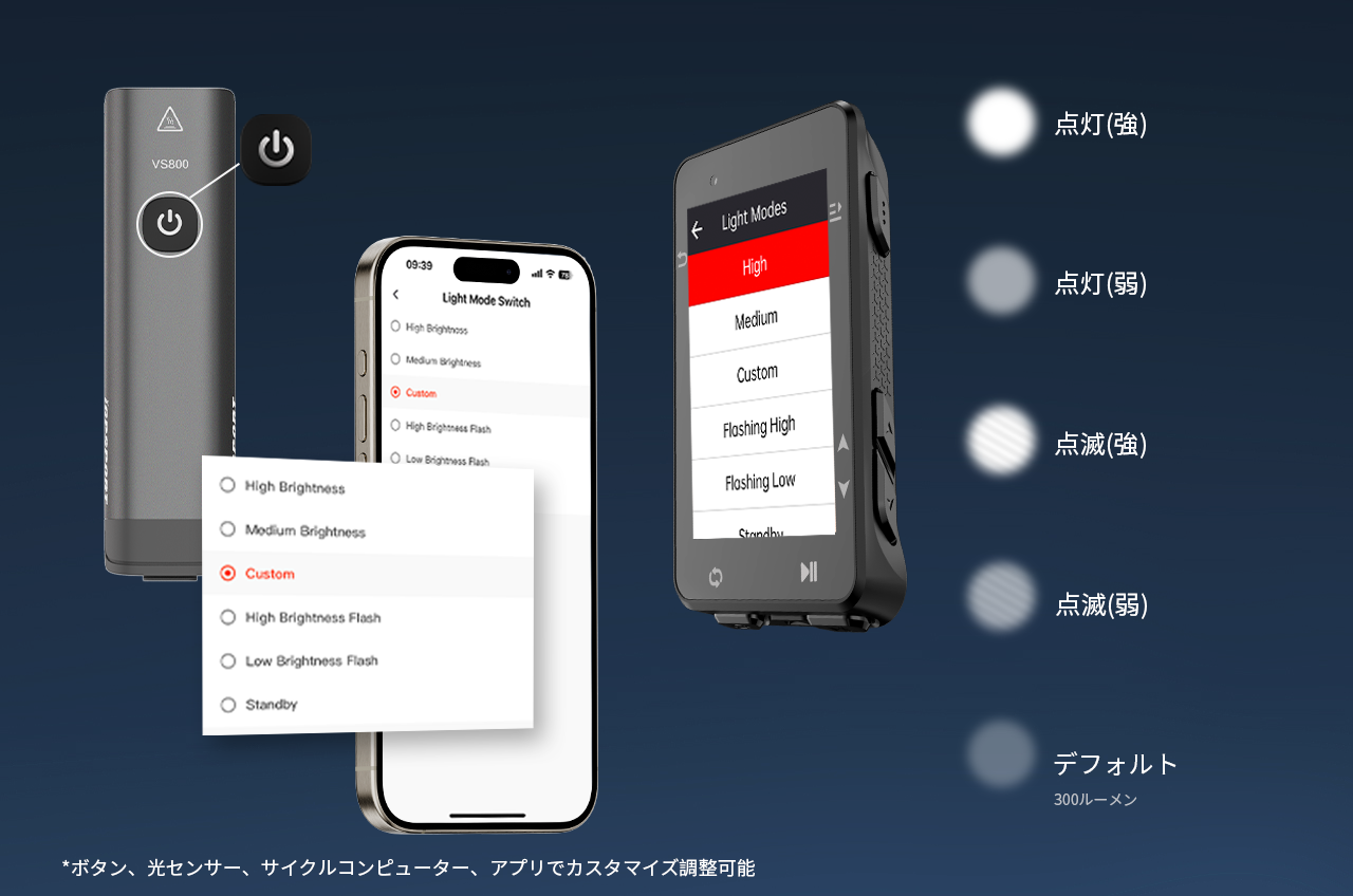 高輝度 | 中輝度 | 高輝度フラッシュ | 低輝度フラッシュ | スリープ | カスタム