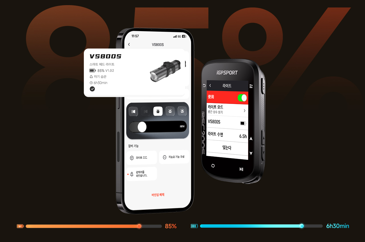 VS800S는 자전거 컴퓨터에 연결하여 조명 모드를 선택하고, 실시간 배터리 잔량 및 남은 사용 시간을 정확히 확인하며, 자전거 컴퓨터와 전원 끄기 기능을 동기화할 수 있습니다.