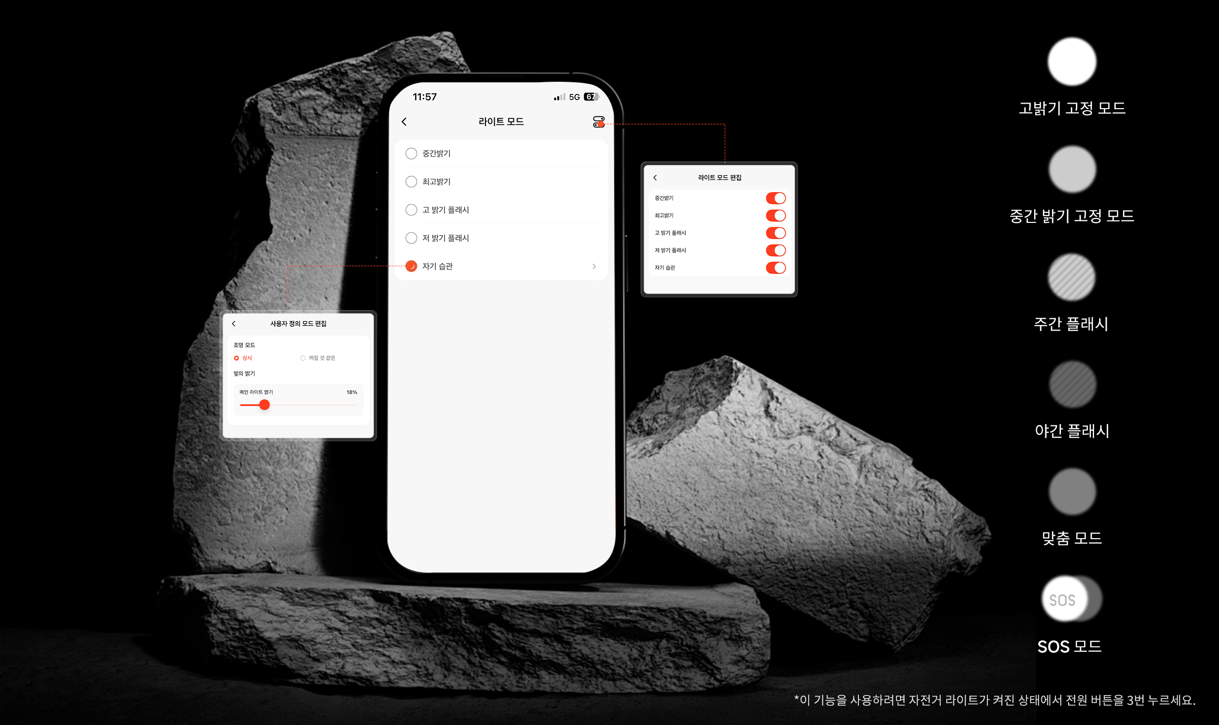 라이딩 가속 시, 속도를 높이면 자전거 라이트가 자동으로 밝아져 안전을 지켜줍니다. 조작 없이도 라이딩에만 집중할 수 있습니다.