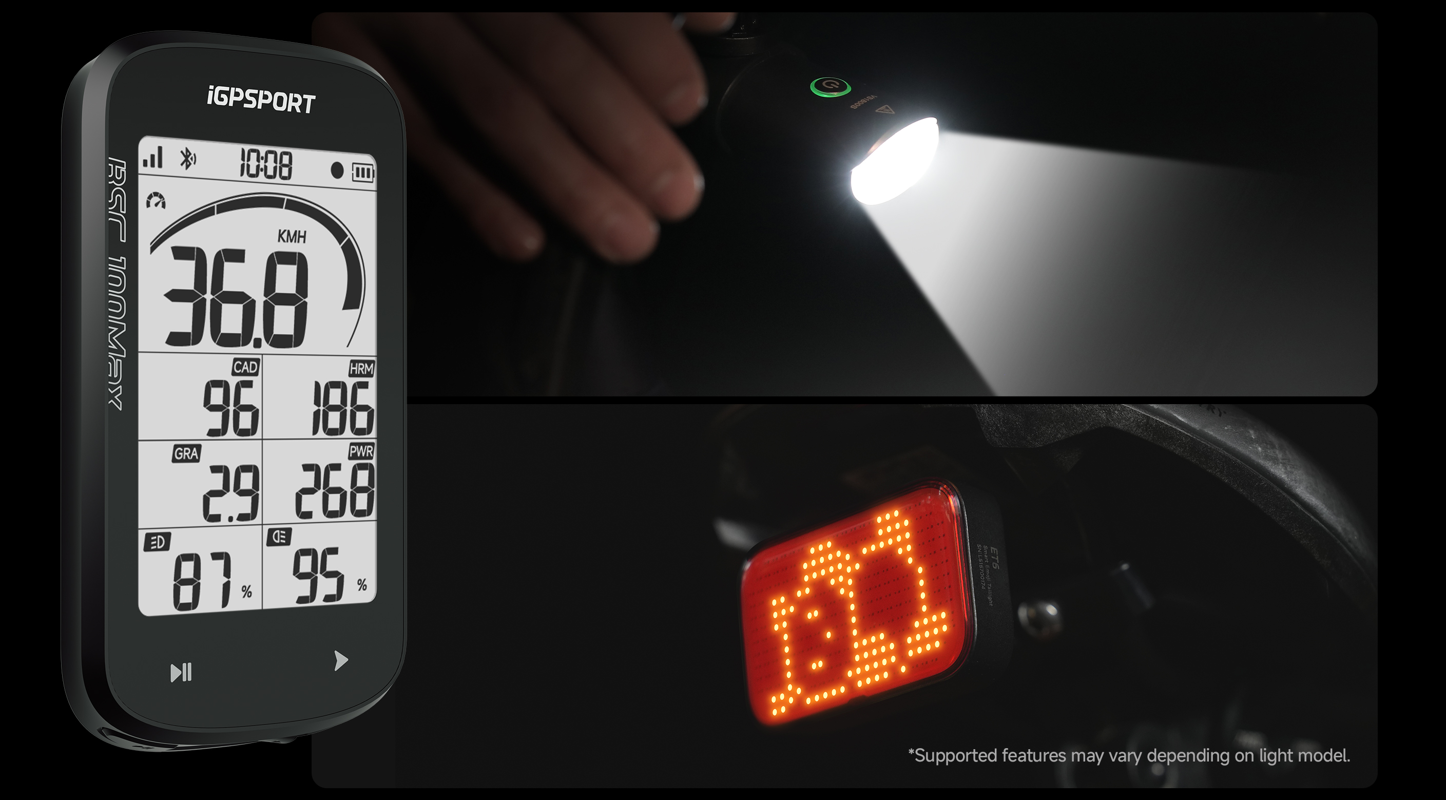 Supports connection and control of iGPSPORT front and tail lights. View battery levels, switch light modes with one touch, and sync lights with your bike computer.*