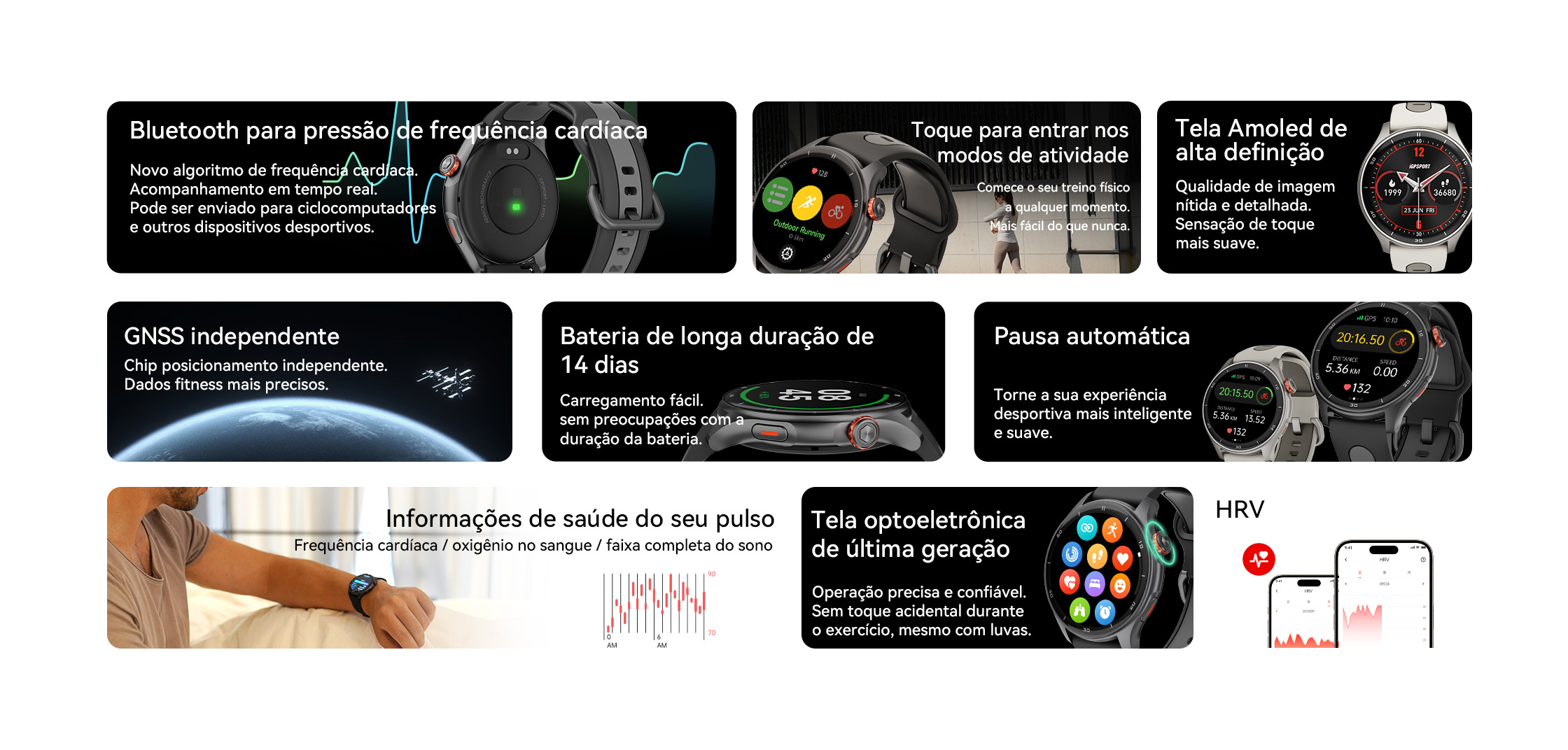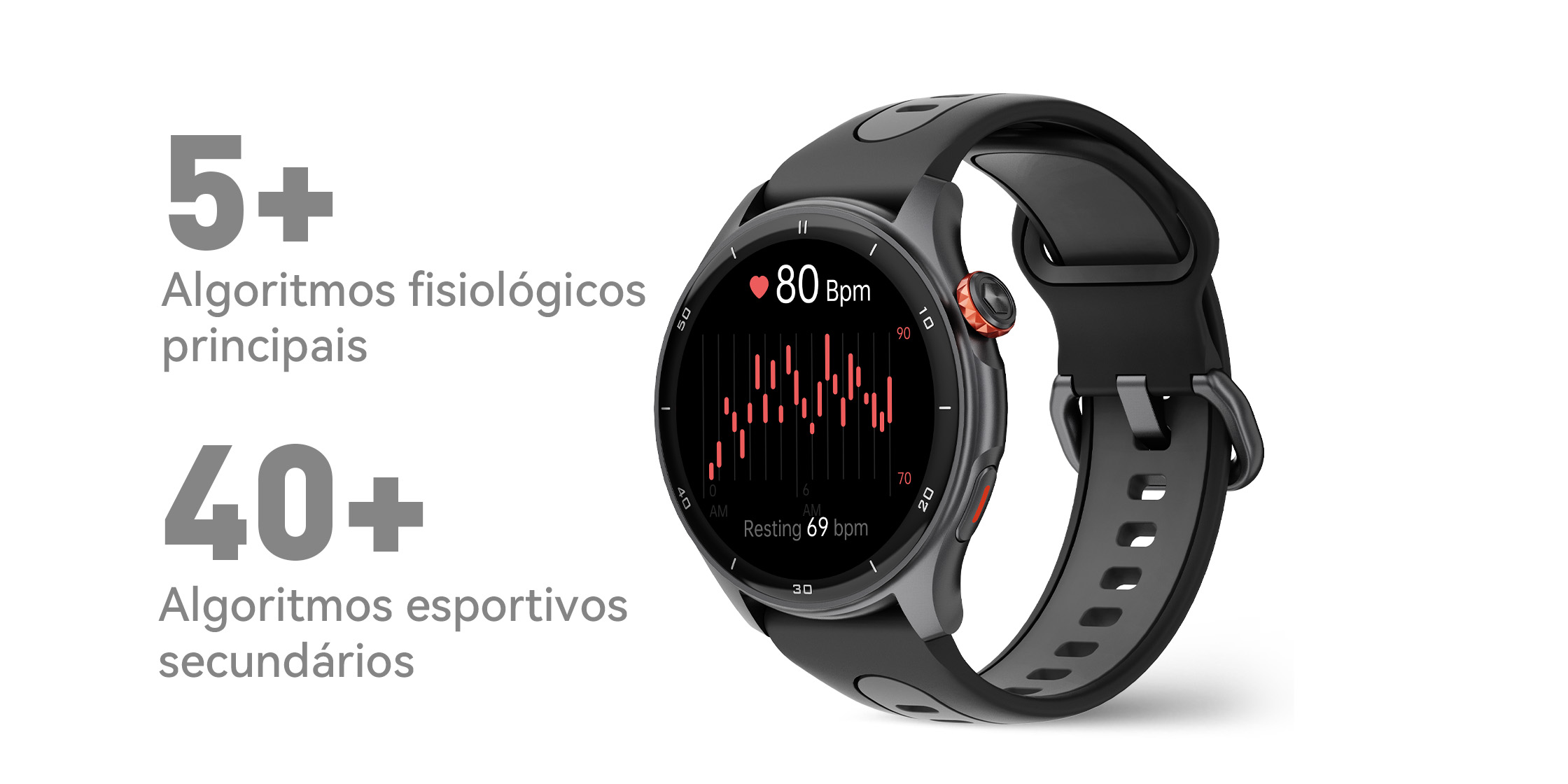 Sensor óptico de frequência cardíaca, sensor de aceleração, sensor geomagnético, sensor de pressão barométrica, GPS