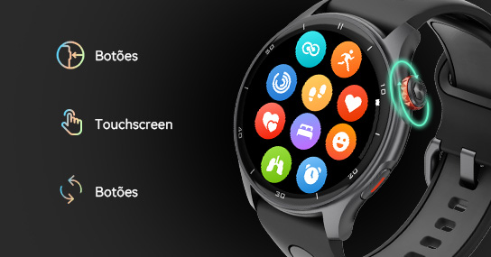 Múltiplos modos de operação, incluindo tela sensível ao toque, tecla e botão rotativo.