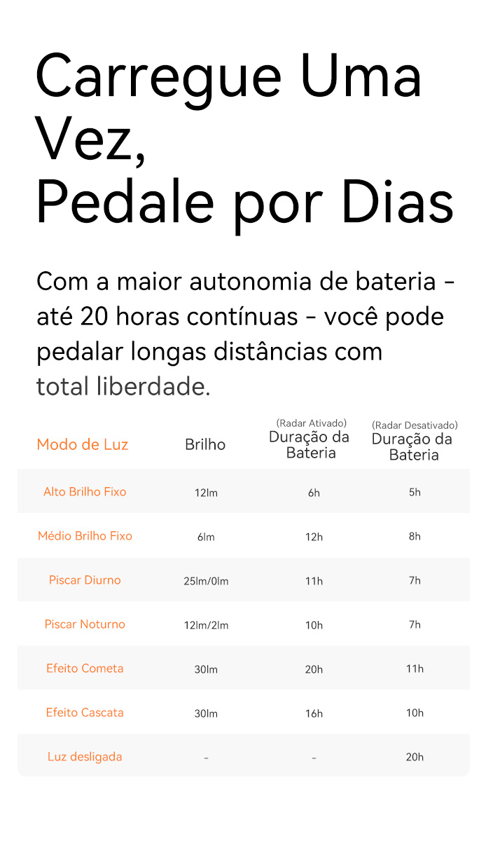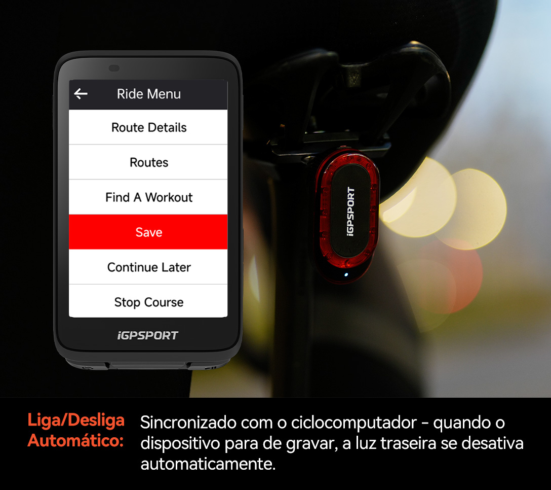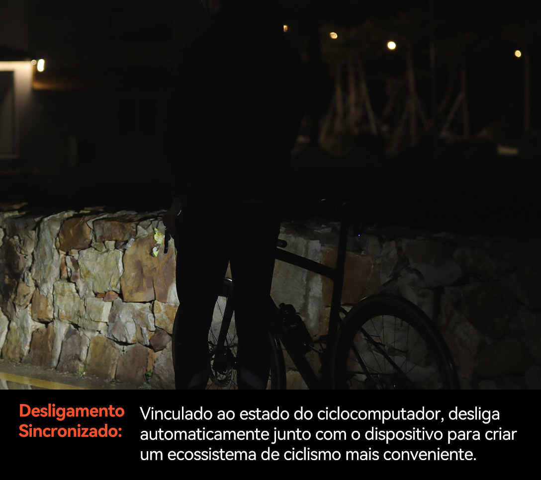 Com base no sensor de luz do ciclocomputador, a luz traseira acende automaticamente quando escurece ou ao entrar em um túnel, e desliga automaticamente durante o dia ou ao sair do túnel, sem necessidade de operação manual, proporcionando proteção inteligente para pedaladas noturnas.