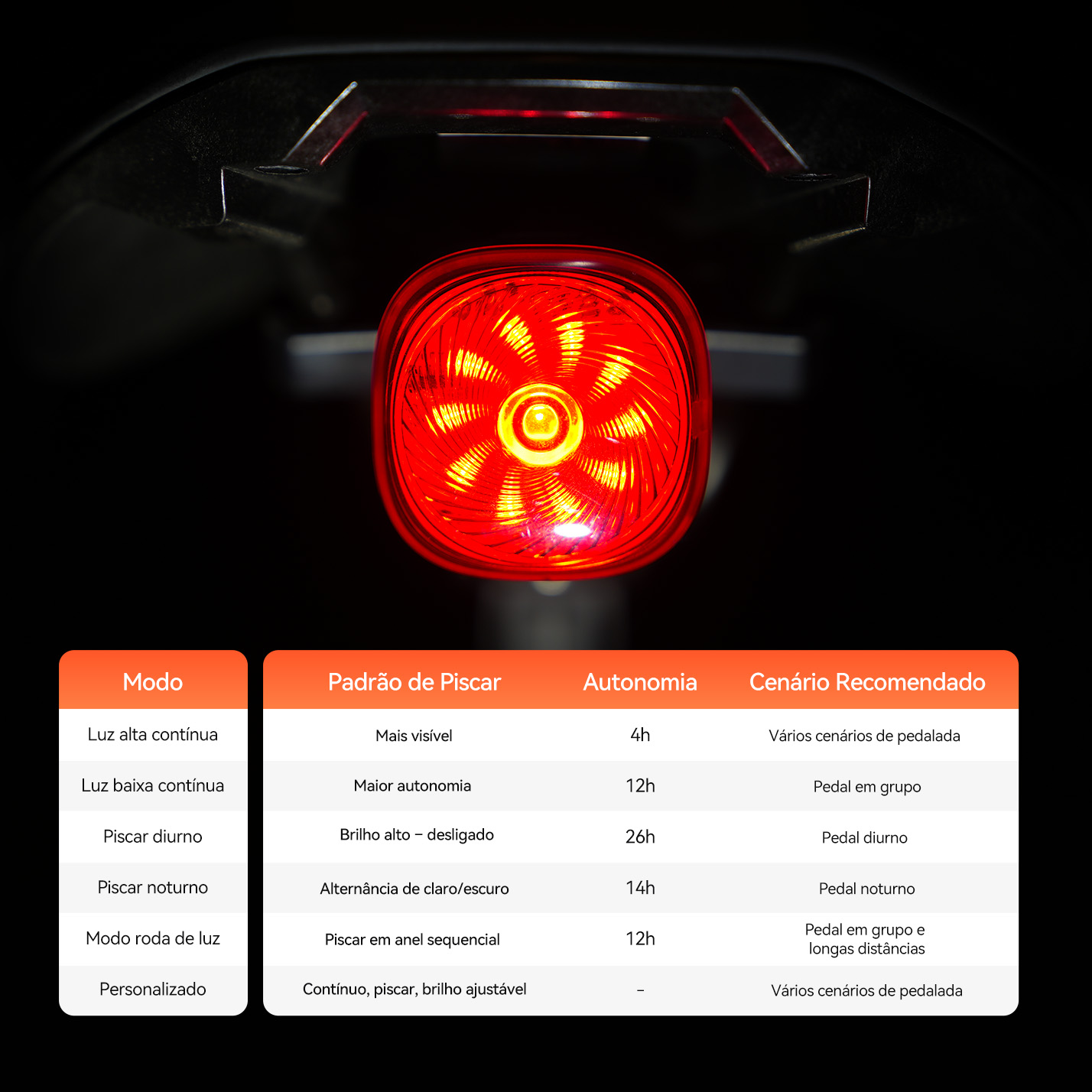 Visível a até 1,2 km, brilho máximo de 50lm, ângulo de visibilidade de 280°. Veículos/pedestres laterais e traseiros podem ver claramente, eliminando pontos cegos e oferecendo proteção completa.