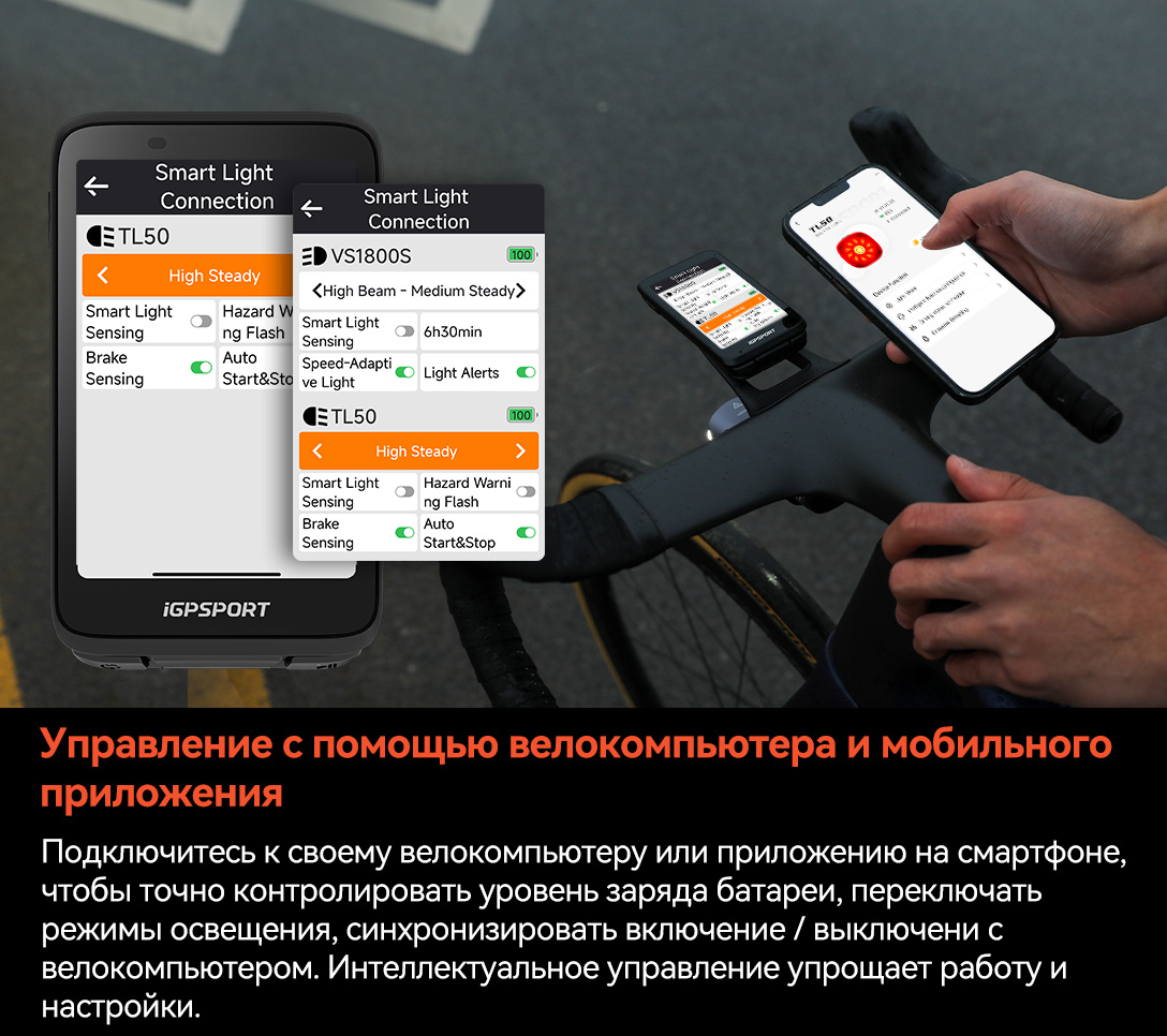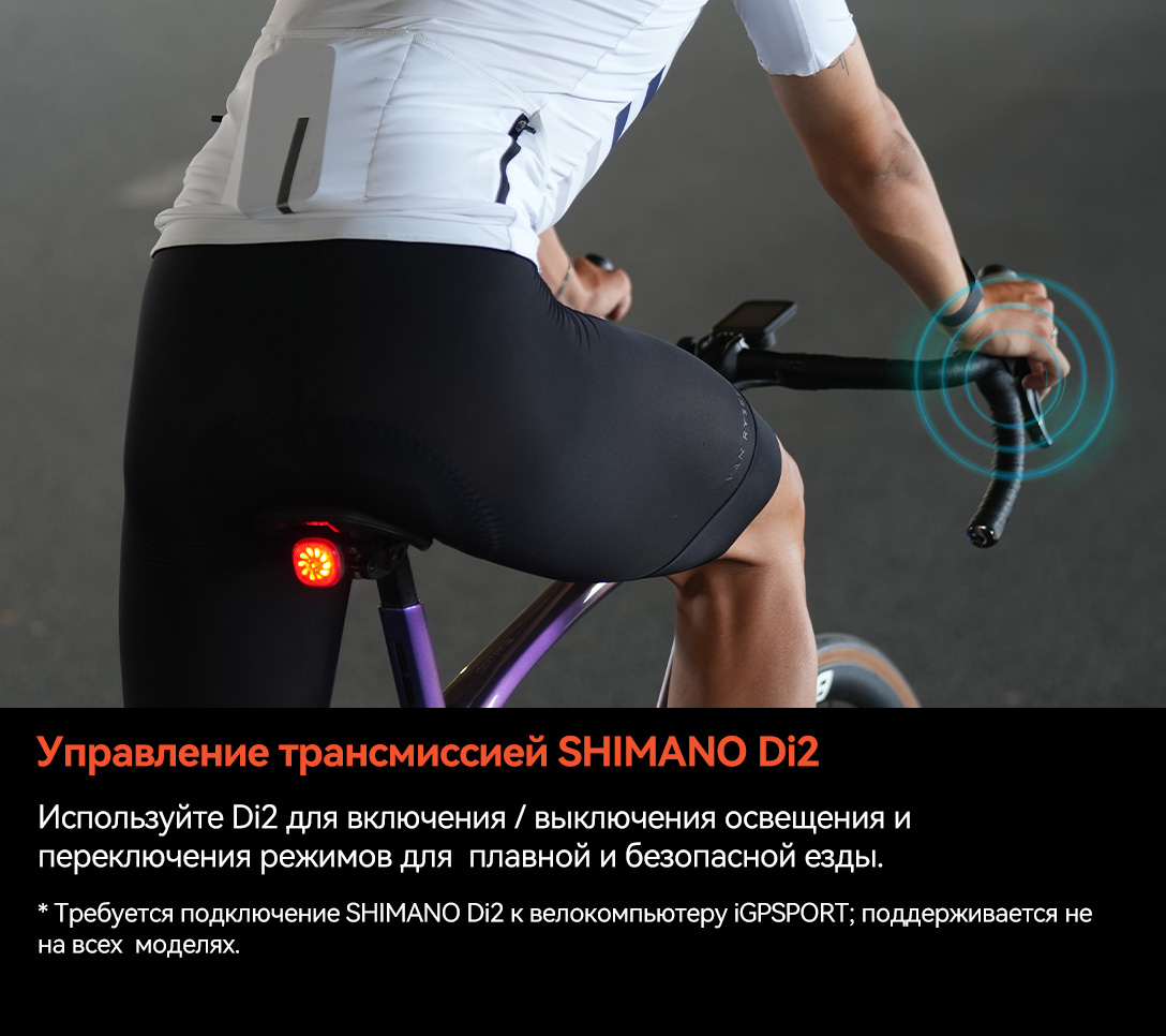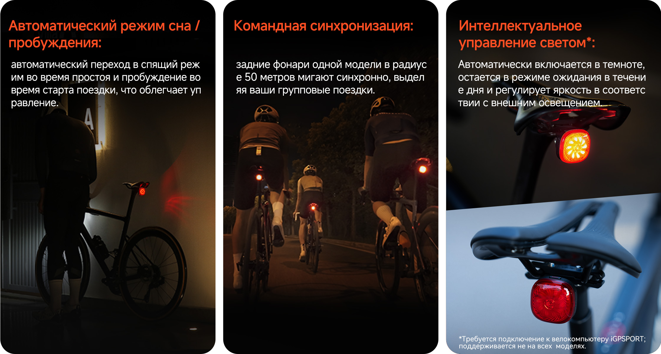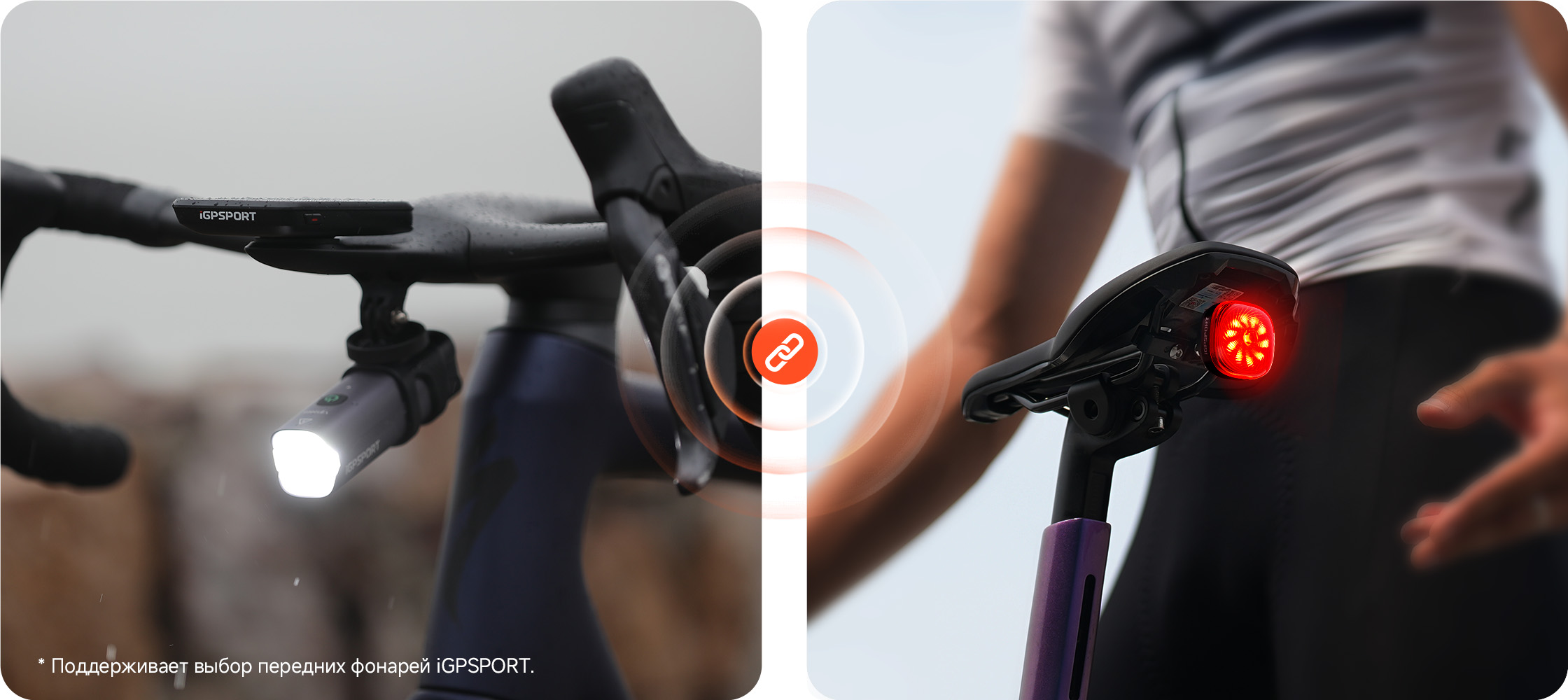 Передние и задние фонари автоматически подключаются, когда они находятся поблизости, что позволяет осуществлять включение / выключение одним нажатием ⁴-для слаженной совместной работы.