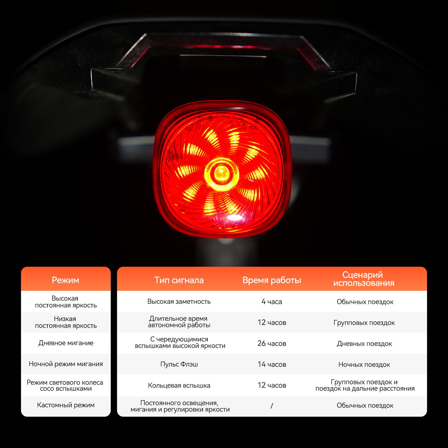 Красный свет виден на расстоянии до 1,2 км, с максимальной яркостью 50 лм и сверхшироким углом обзора 280°. Виден сбоку и сзади, что обеспечивает отсутствие слепых зон и всестороннюю заметность.