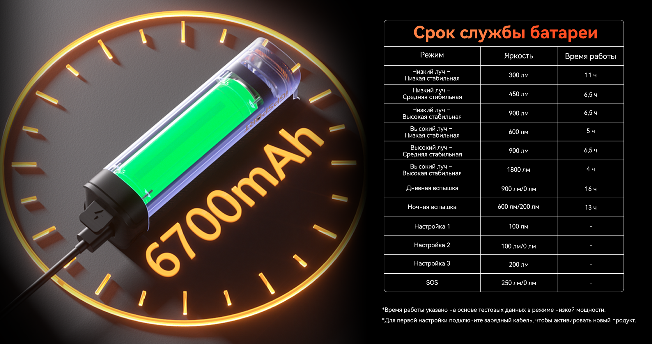 Интеллектуальный термоконтроль: встроенный датчик температуры поддерживает температуру ниже 55°C, предотвращая перегрев и обеспечивая стабильную яркость, а также продлевая срок службы аккумулятора.